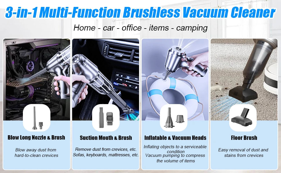 What a handy tool! The 3-in-1 design works perfectly: vacuum, blower and duster. Ideal for my car, workshop and even the living room couch. Excellent build and performance.